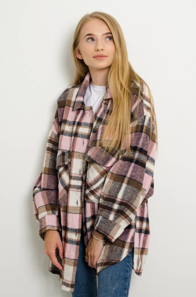 KURTKA KOSZULOWA W KRATĘ - RÓŻOWA