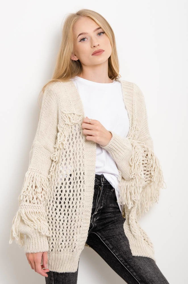 AŻUROWA NARZUTKA Z FRĘDZLAMI W KOLORZE BEŻOWYM