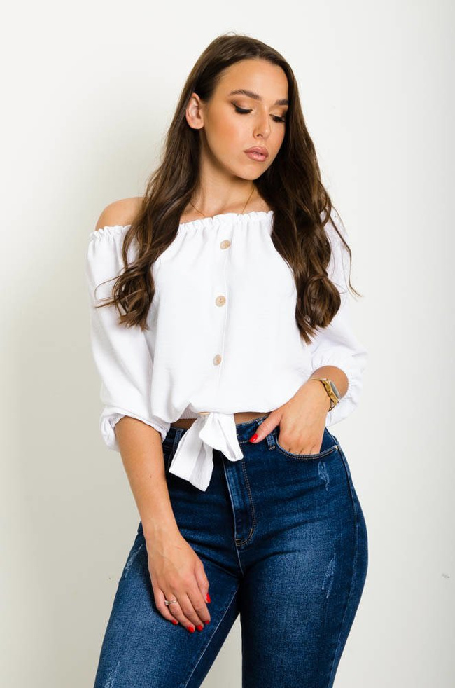 BIAŁA BLUZKA Z GUMĄ W DEKOLCIE ORAZ WIĄZANIEM NA DOLE.