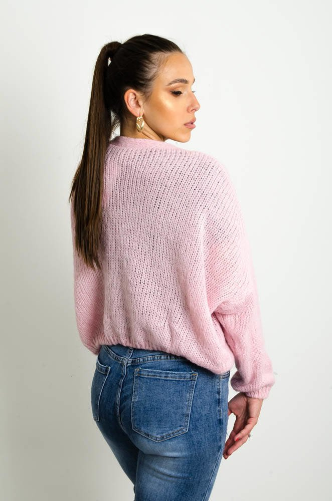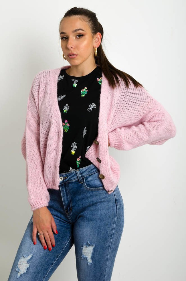 KRÓTKI KARDIGAN SWETER ZAPINANY NA GUZIKI Z DEKOLTEM W SEREK