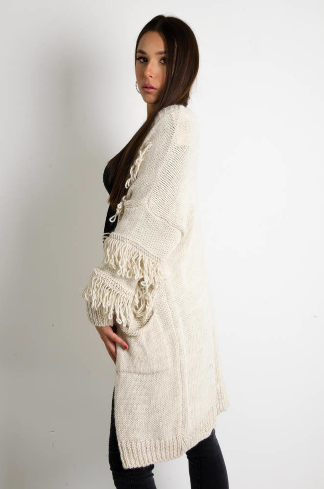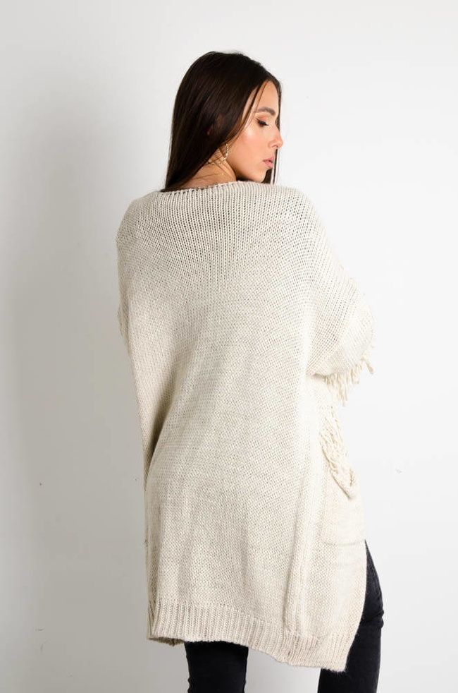 BEŻOWY SWETER KARDIGAN Z FRĘDZLAMI