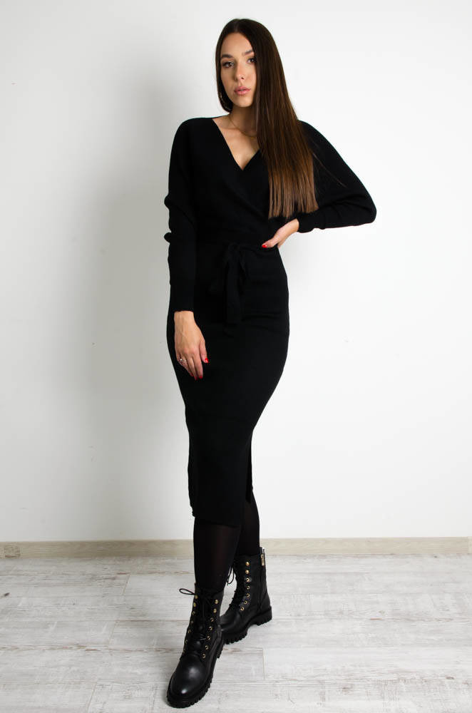 CZARNA PRĄŻKOWANA SUKIENKA MIDI Z ROZCIĘCIEM