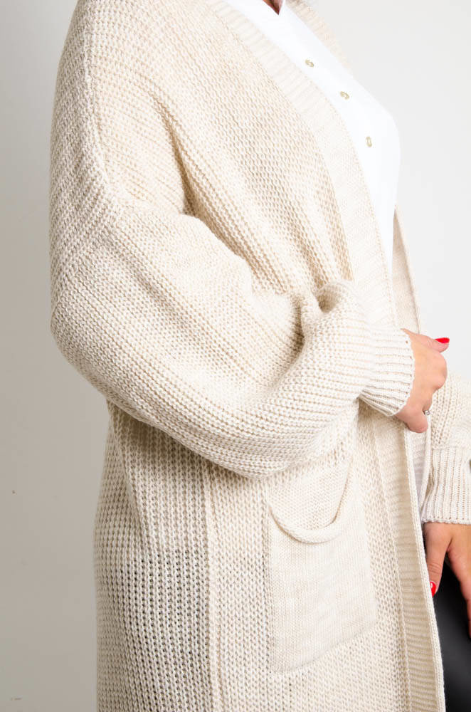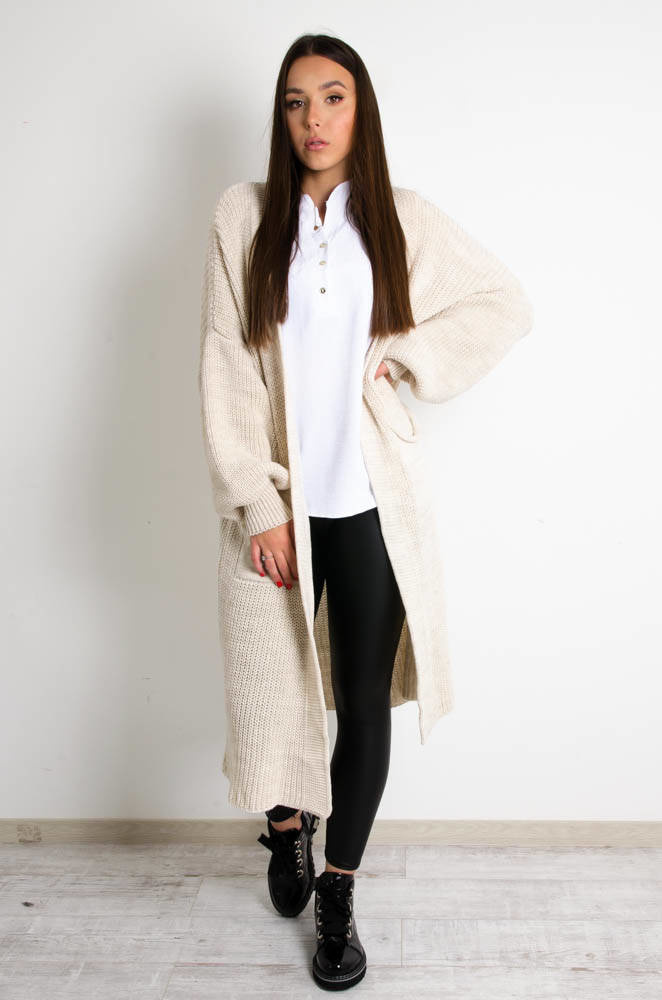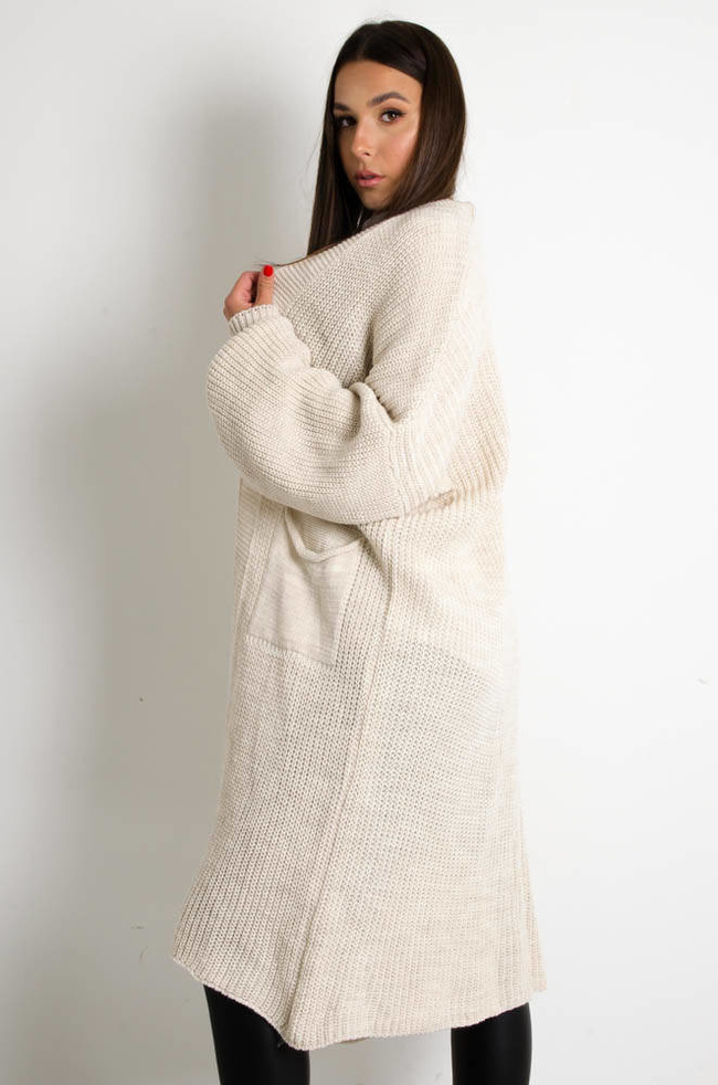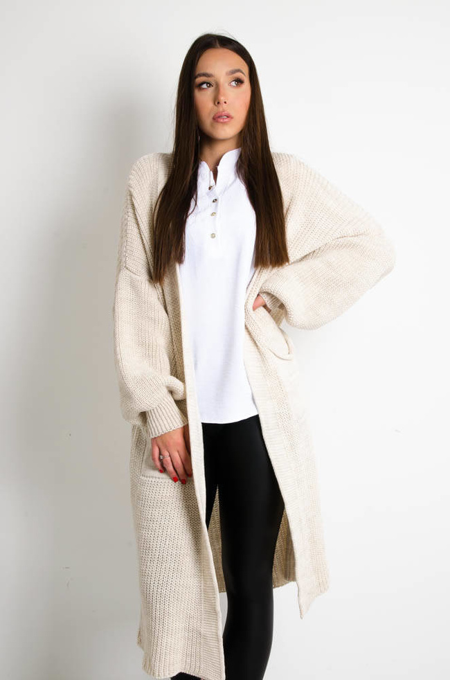 BEŻOWY DŁUGI SWETER KARDIGAN Z SZEROKIMI RĘKAWAMI