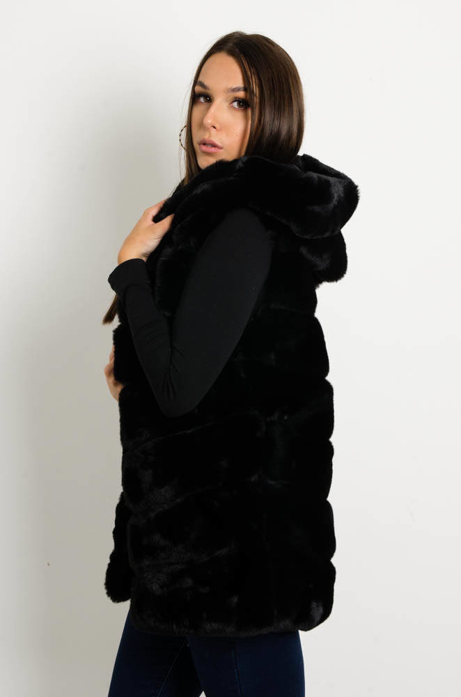 CZARNA FUTRZANA KAMIZELKA Z KAPTUREM
