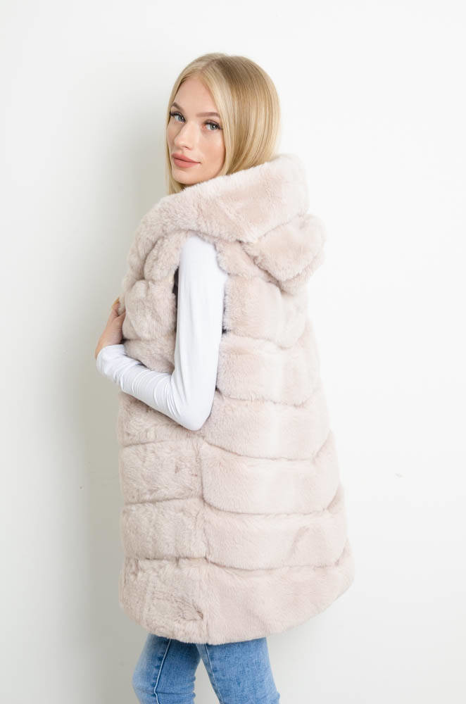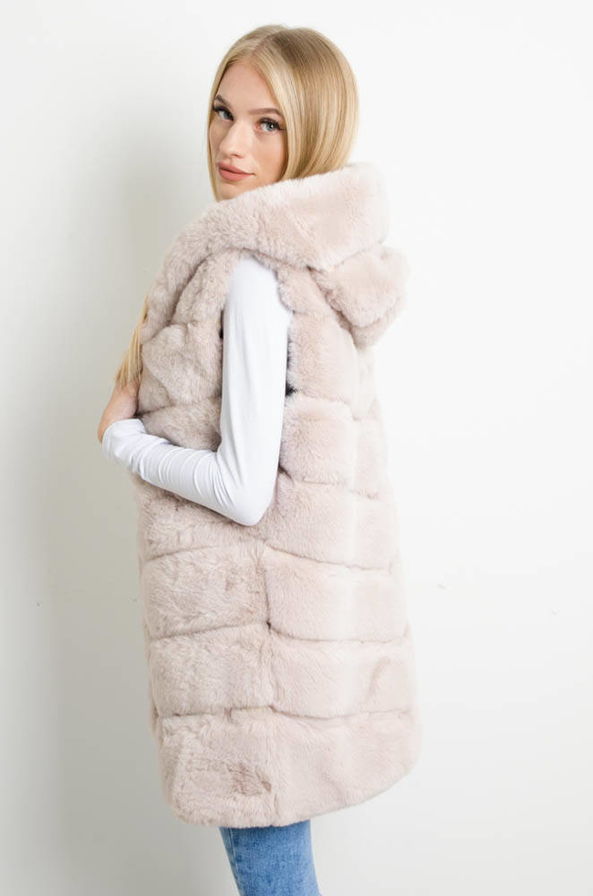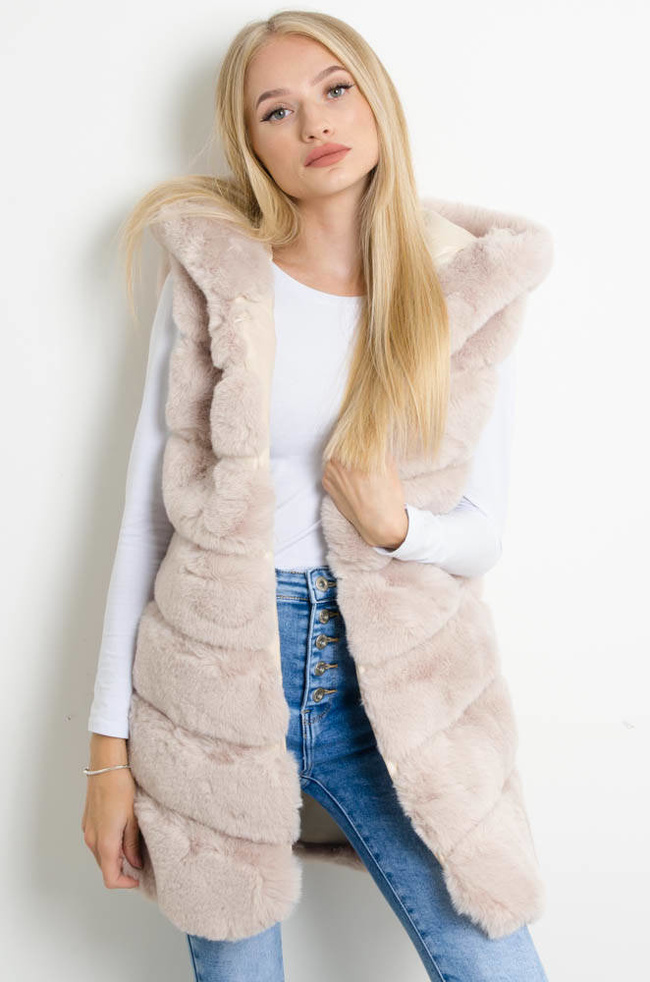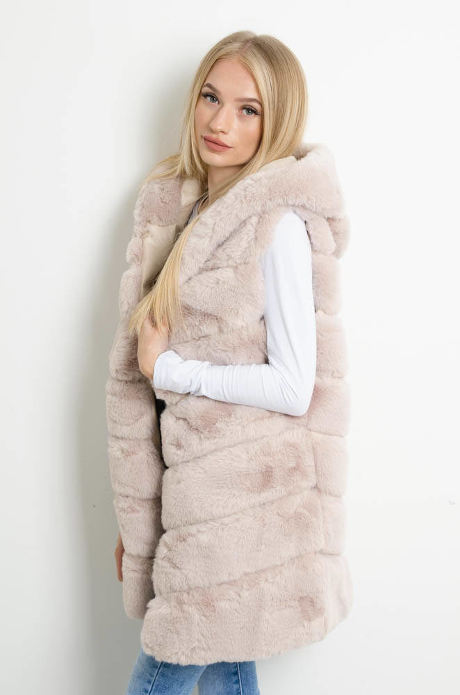 BEŻOWA FUTRZANA KAMIZELKA Z KAPTUREM