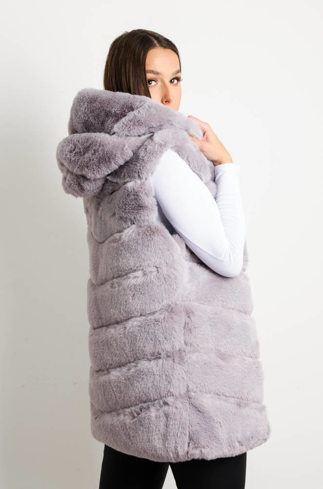 SZARA FUTRZANA KAMIZELKA Z KAPTUREM