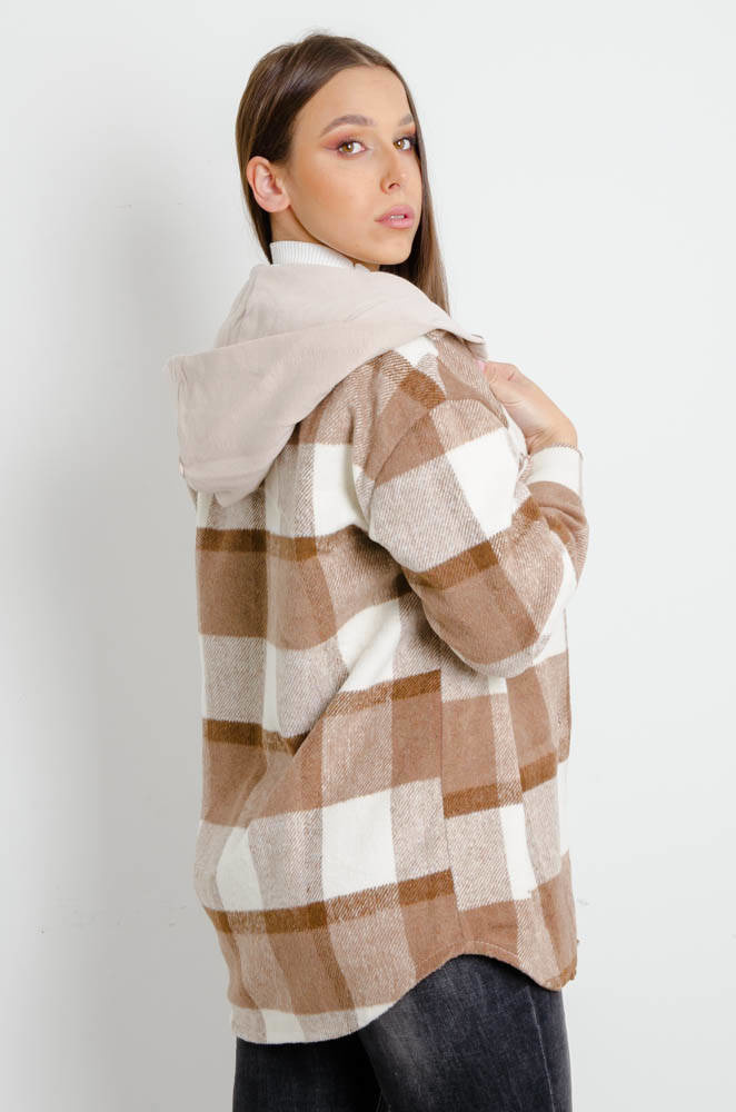 BRĄZOWA KURTKA KOSZULA W KRATĘ Z KAPTUREM