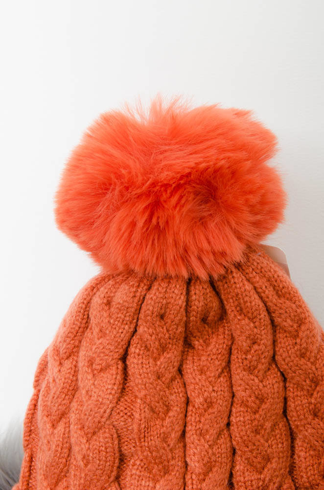 POMARAŃCZOWA ZIMOWA CZAPKA PLECIONA Z POMPONEM