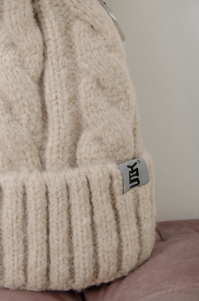 BEŻOWA ZIMOWA CZAPKA PLECIONA Z POMPONEM