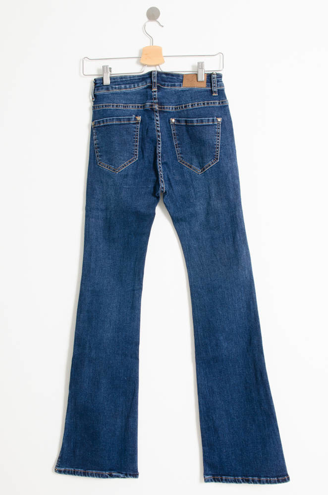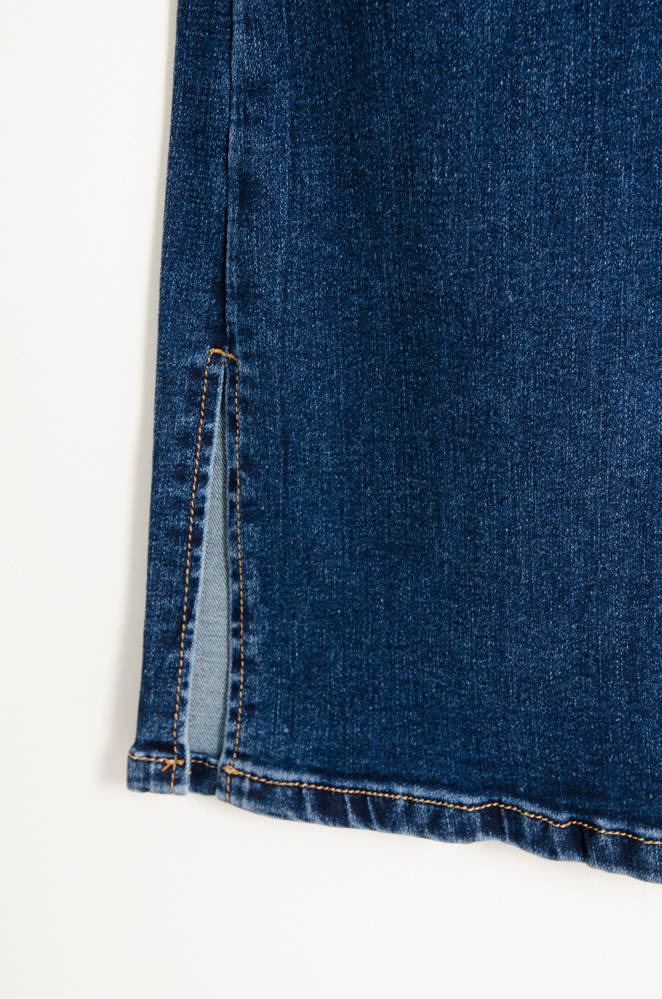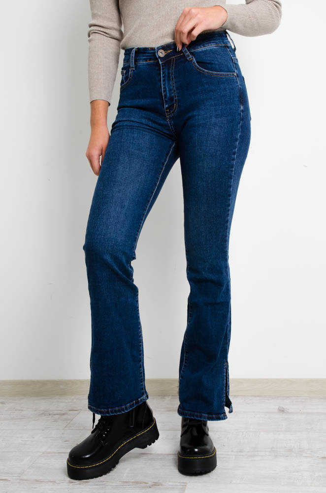 Jeansy z lekko elastycznego denimu z wysokim stanem. Rozporek zapinany na guzik i i suwak. Szerokie nogawki z rozcięciem.