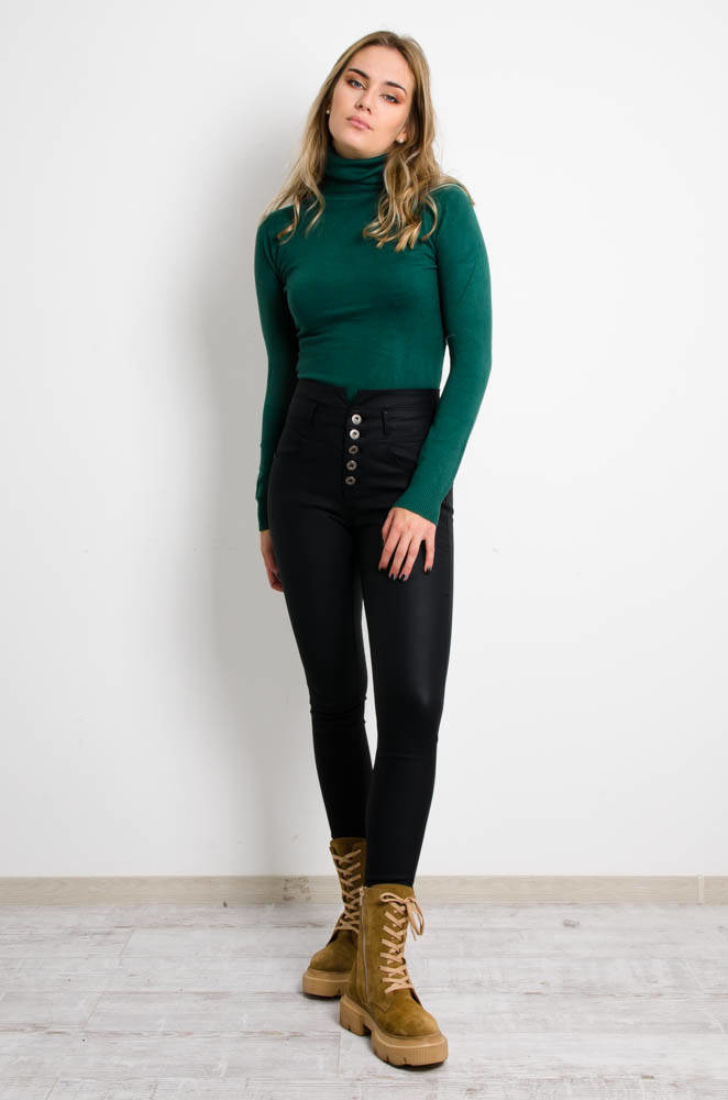 Spodnie woskowane z funkcją modelowania, trzymają i podkreślają talię, uda i pośladki oraz zachowują kształt. Wysoki stan, rozporek na guziki. Obcisłe nogawki.