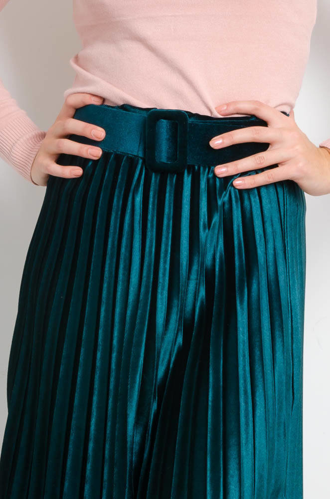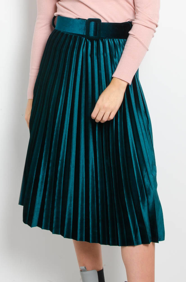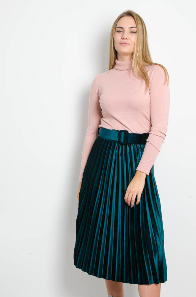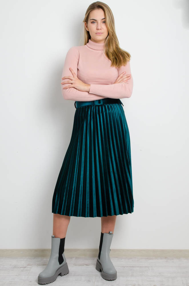 ZIELONA WELUROWA PLISOWANA SPÓDNICA Z PASKIEM-MIDI