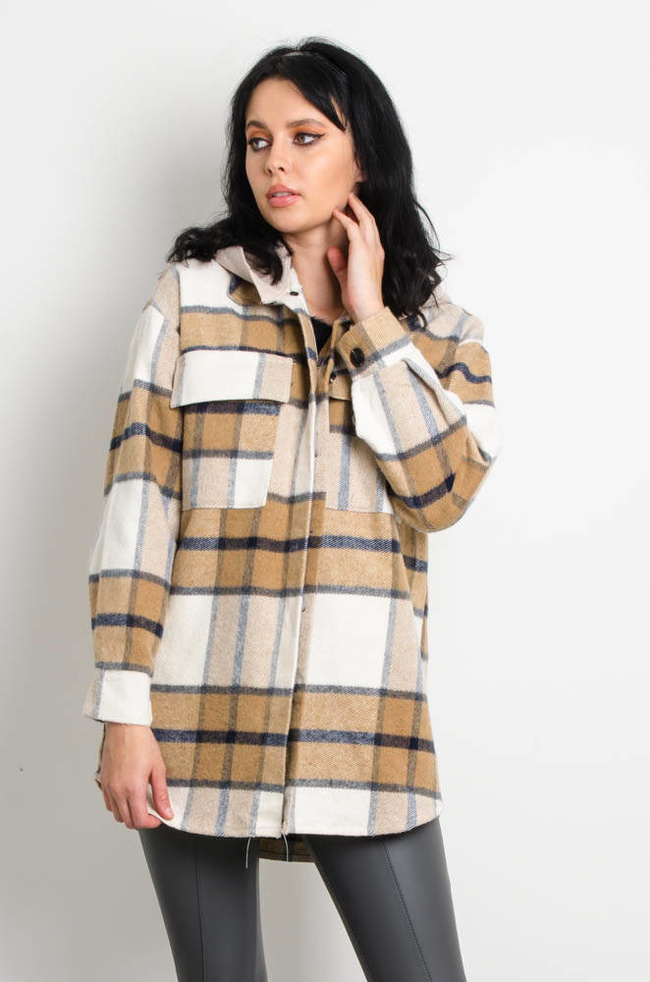 BEŻOWA KURTKA KOSZULA W KRATĘ Z KAPTUREM