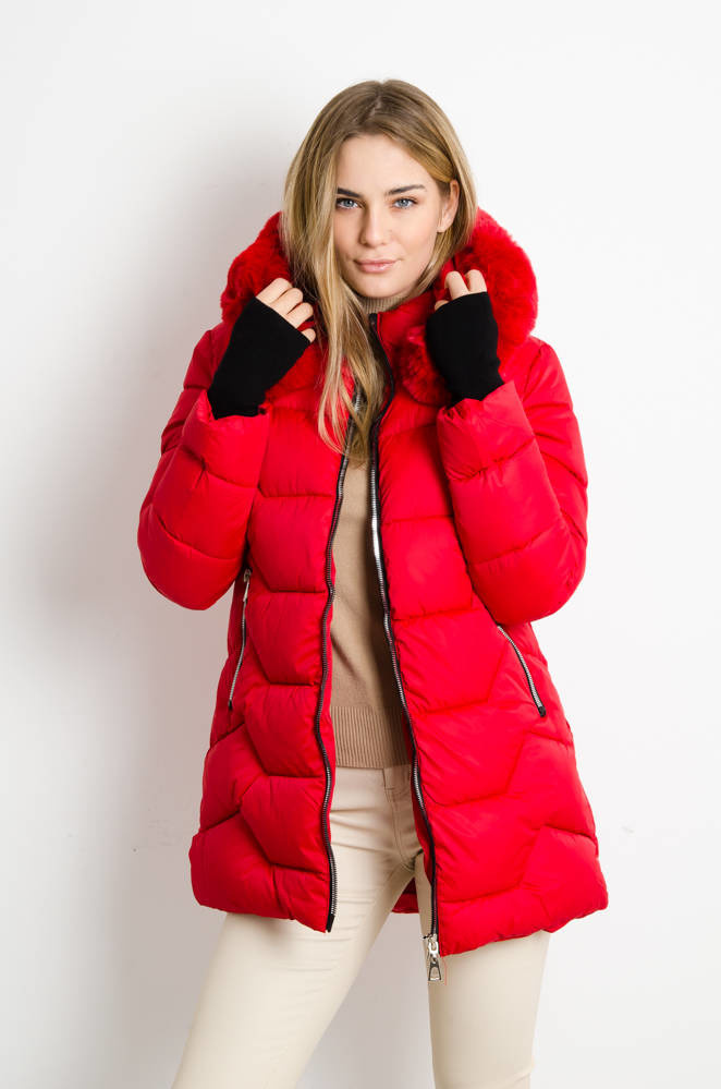 CZERWONA MATOWA KURTKA Z FUTERKIEM PRZY KAPTURZE