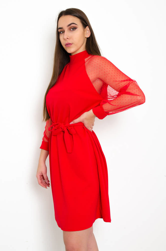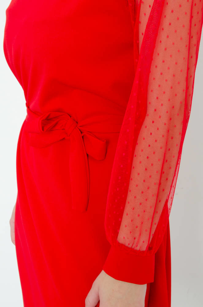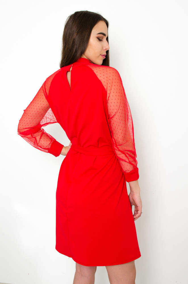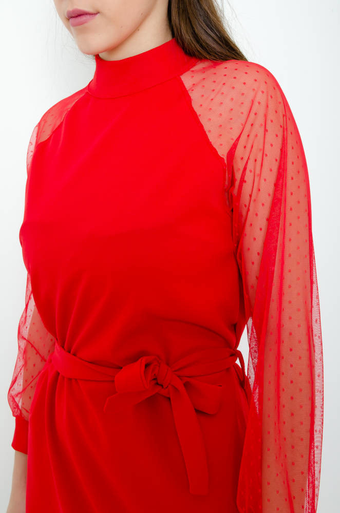 CZERWONA SUKIENKA Z KORONKOWYMI RĘKAWAMI
