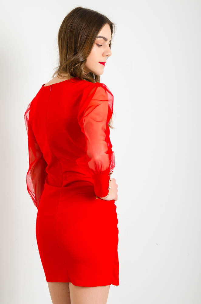 CZERWONA KOPERTOWA SUKIENKA Z TIULOWYMI RĘKAWAMI