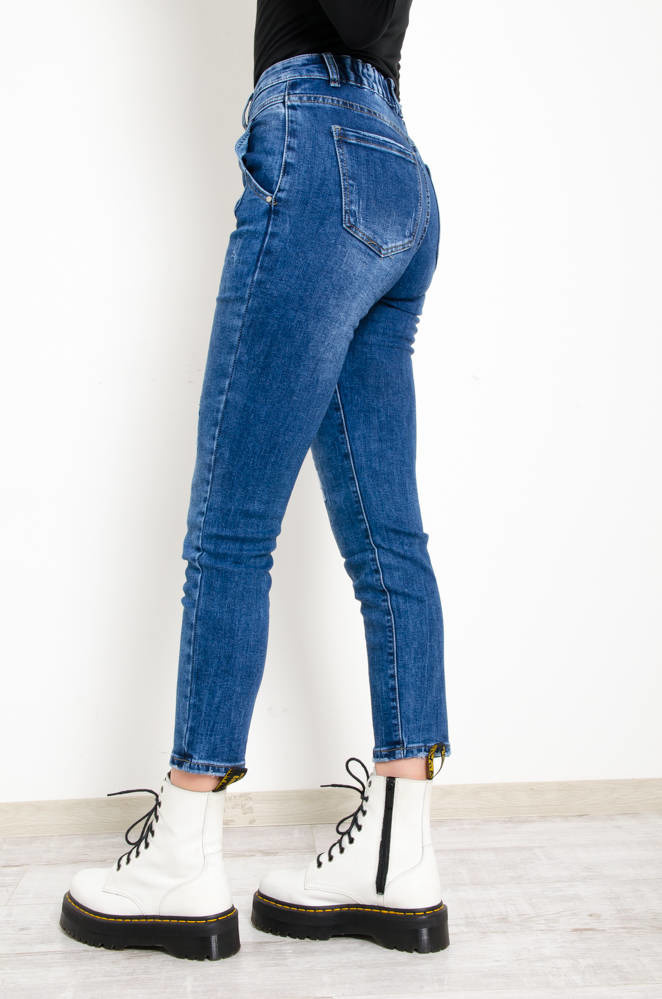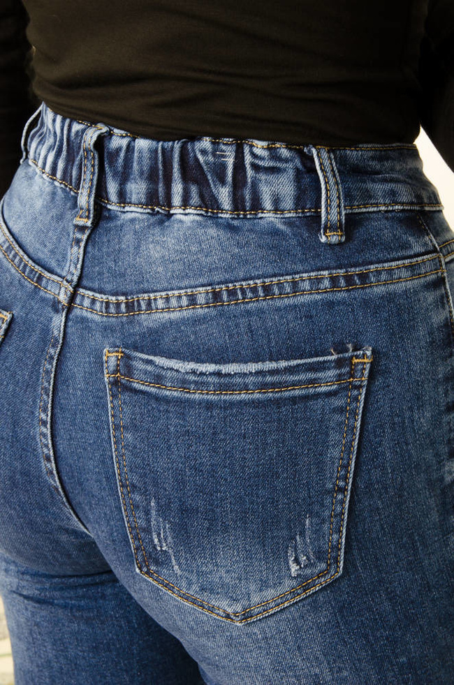 JEANSOWE SPODNIE MOM FIT Z PRZETARCIAMI I GUMKĄ W PASIE-WYSOKI STAN