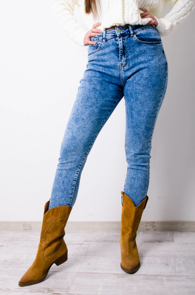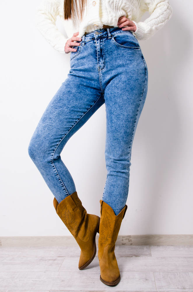 NIEBIESKIE DEKATYZOWANE SPODNIE JEANSOWE Z WYSOKIM STANEM