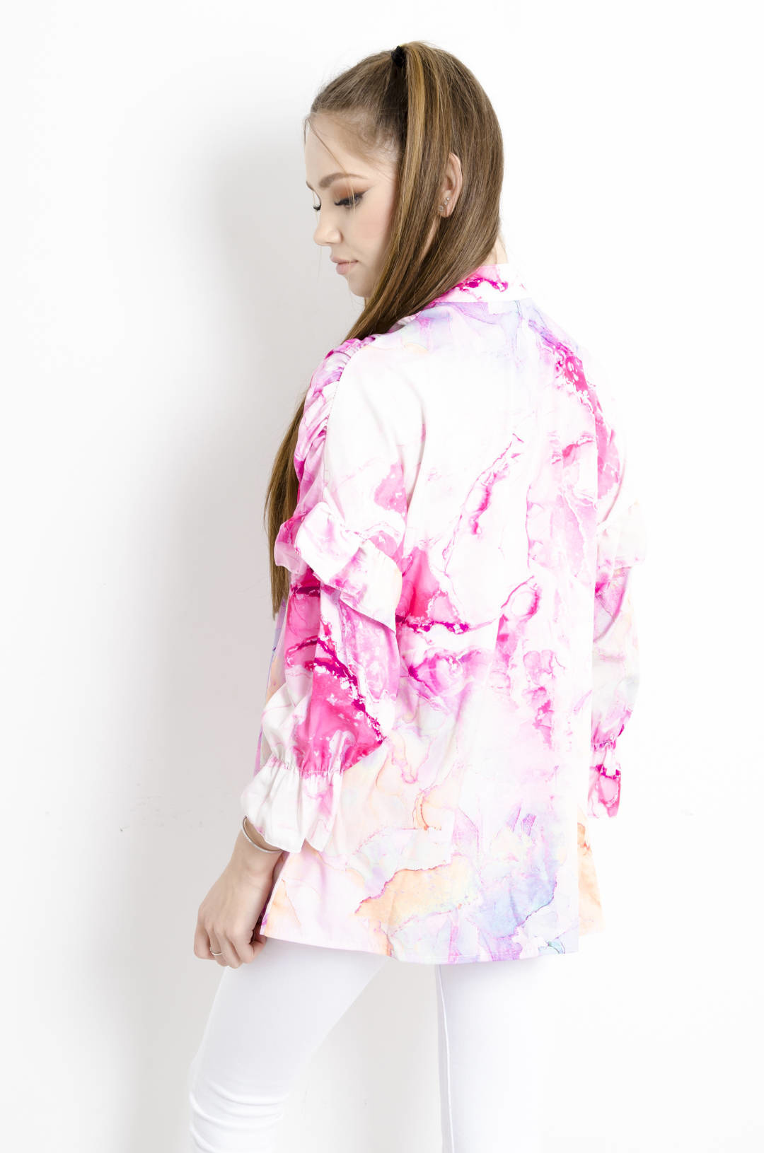 KOSZULA MARMURKOWA Z FALBANAMI NA RĘKAWACH - JASNO-RÓŻOWA