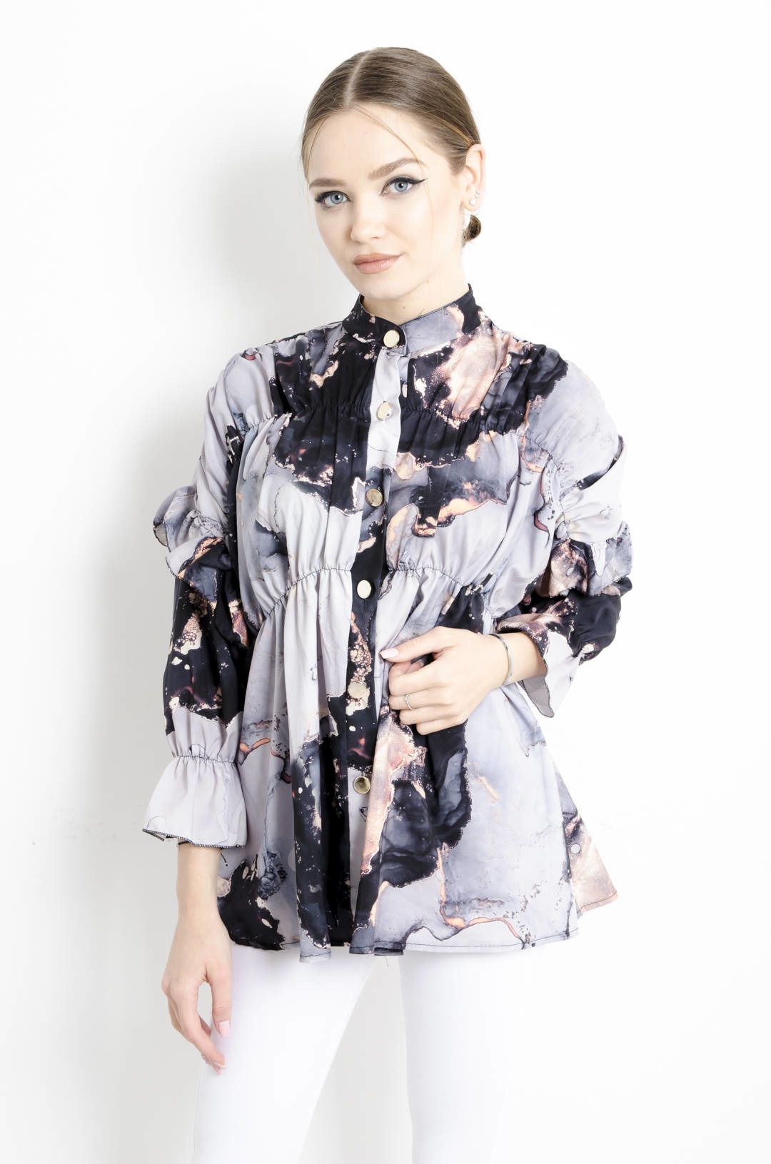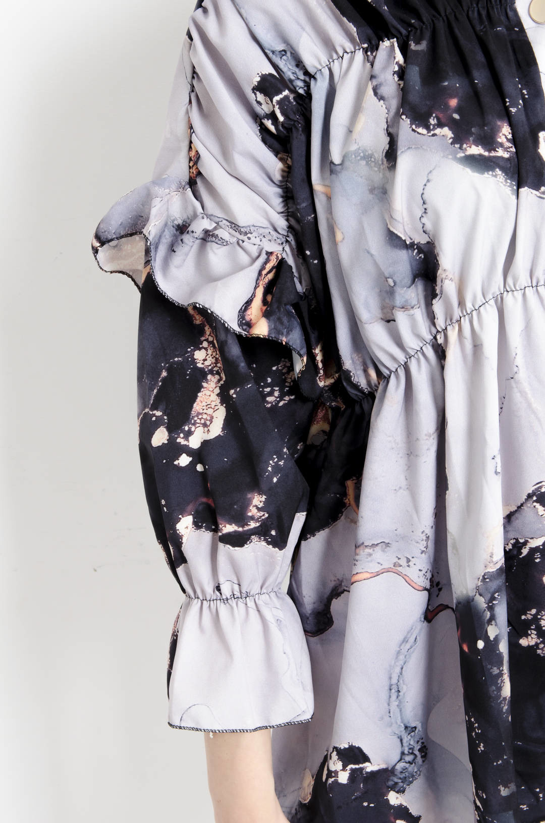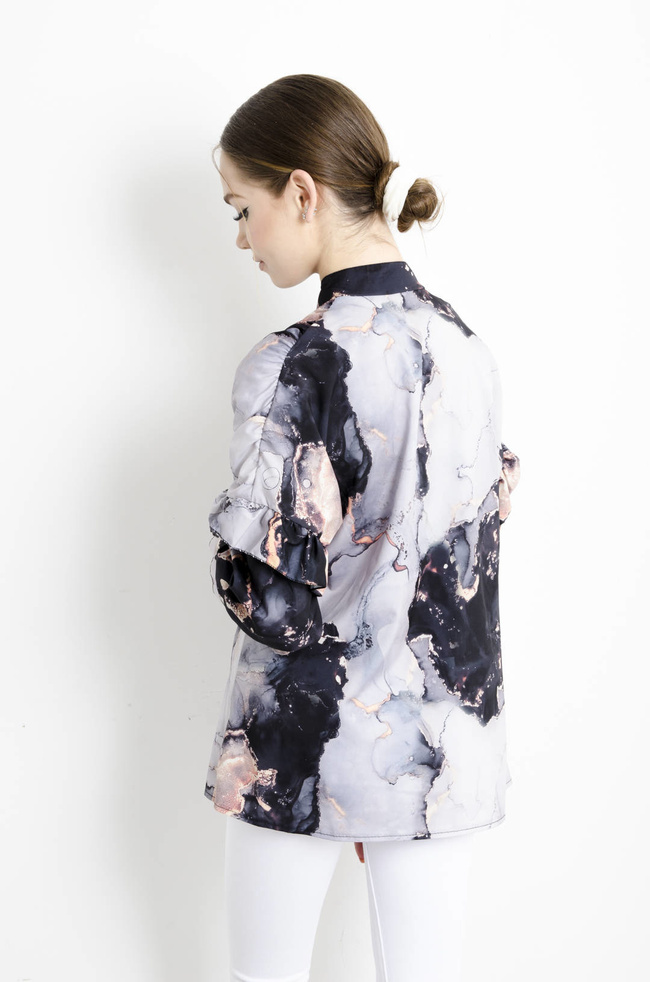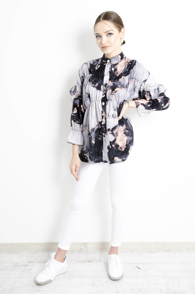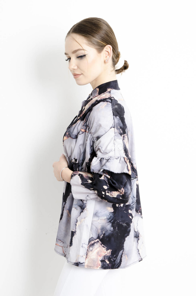 KOSZULA MARMURKOWA Z FALBANAMI NA RĘKAWACH -CZARNA