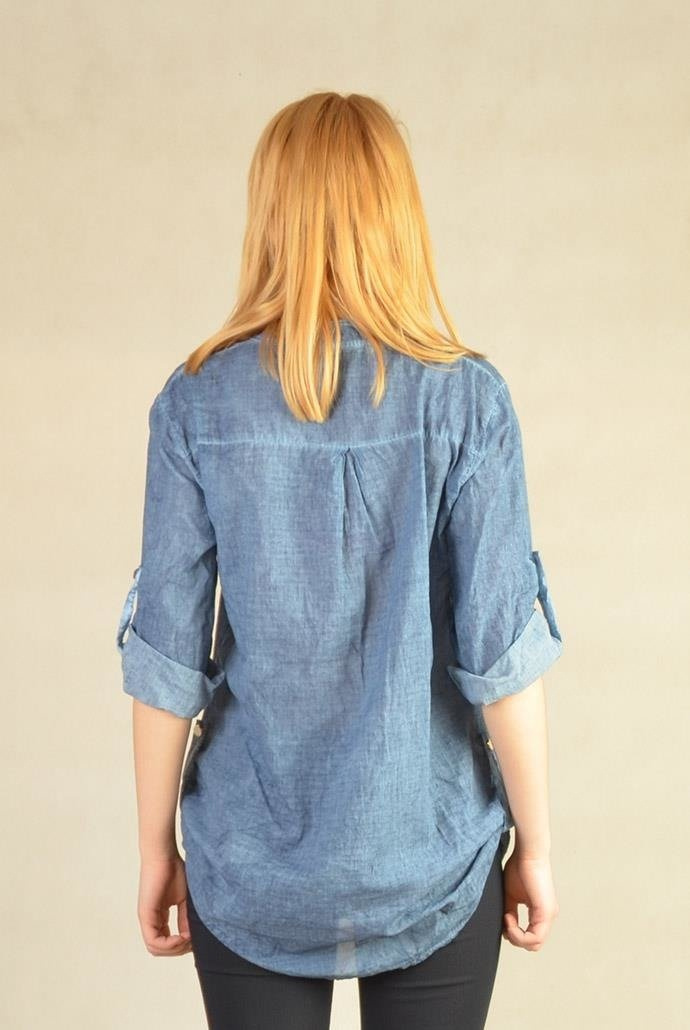 Bluzka koszulowa, zwiewna, prosta i bardzo kobieca. Posiada rozcięcie przy dekolcie i dwie kieszonki na klatce piersiowej, które dodatkowo dodają jej uroku.