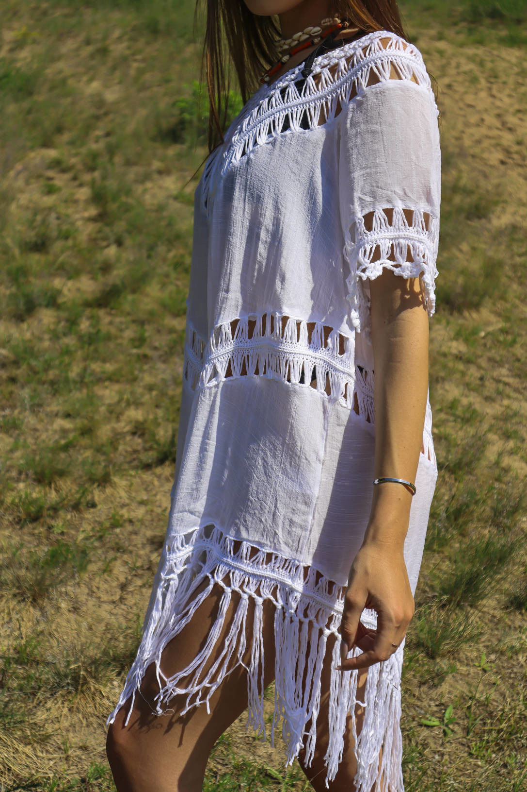 TUNIKA AŻUROWA Z FRĘDZLAMI - BIAŁA