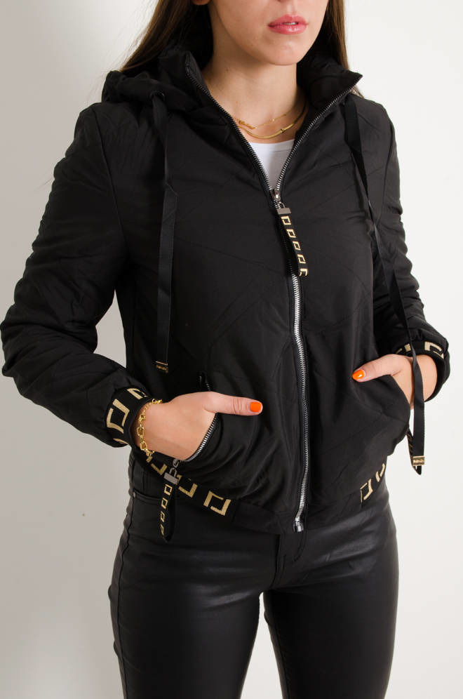 CZARNA KURTKA Z WZORZYSTYMI ŚCIĄGACZAMI I KAPTUREM