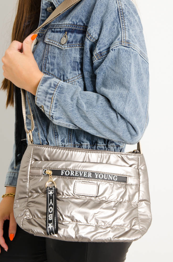 TOREBKA PIKOWANA Z MATERIAŁOWYM PASKIEM- SREBRNA