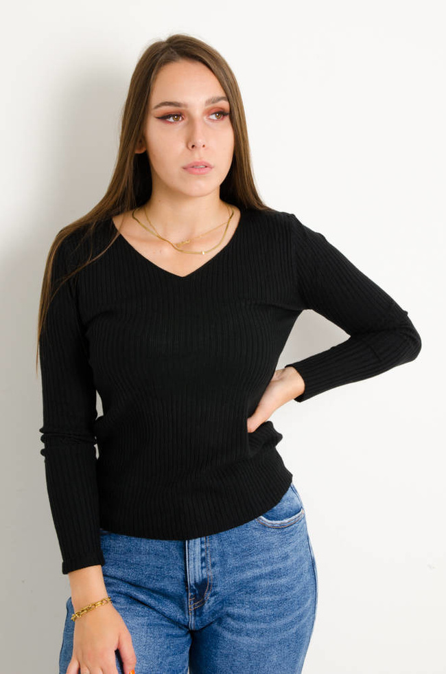 SWETER PRĄŻKOWANY Z DEKOLTEM W SZPIC- CZARNY