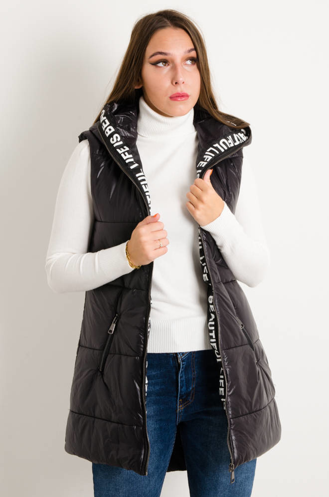 DŁUGA ASYMETRYCZNA KAMIZELKA Z OZDOBNYM PASEM-CZARNA