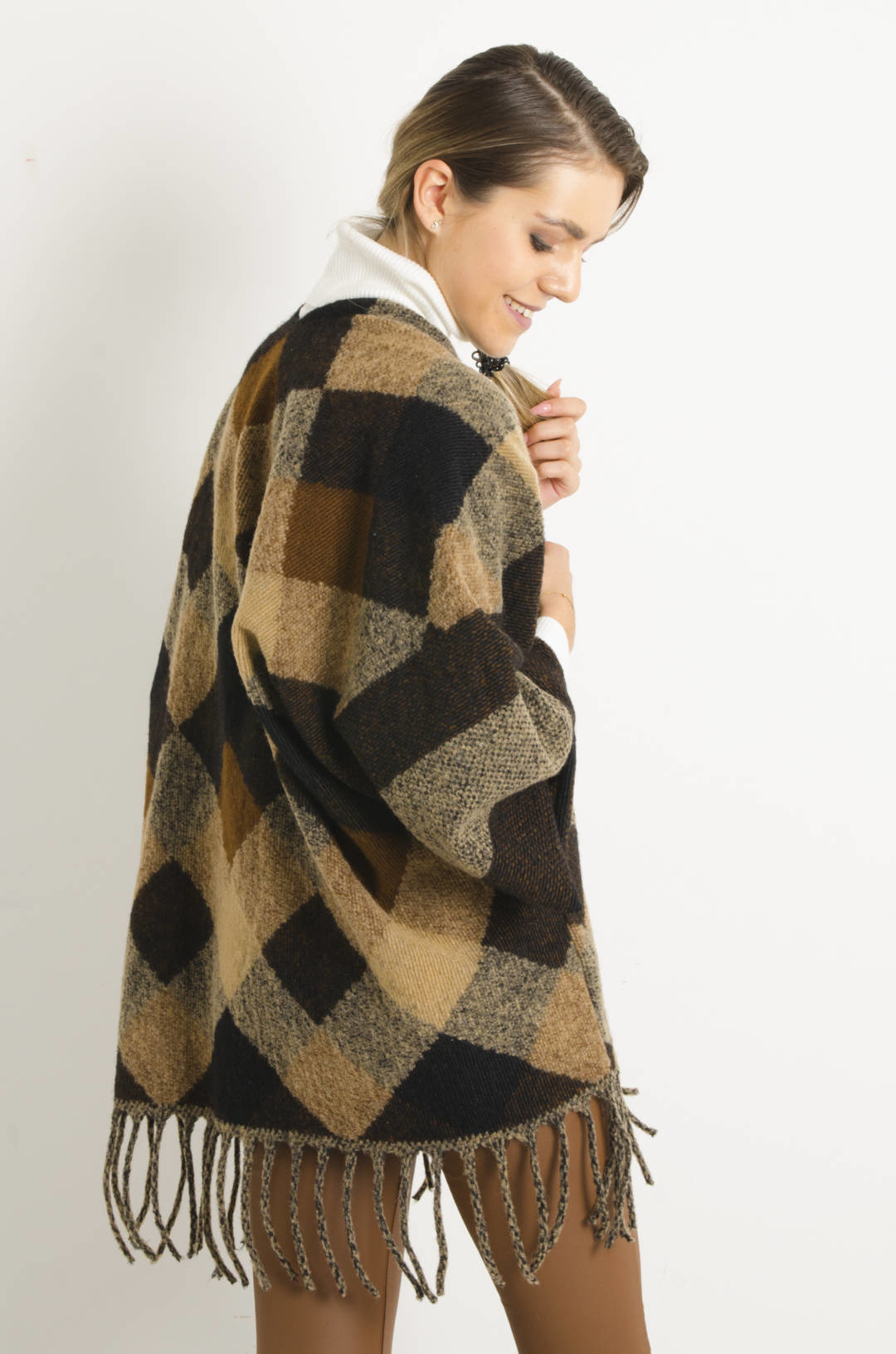 BRĄZOWA NARZUTA W KRATĘ Z FRĘDZLAMI- PONCZO