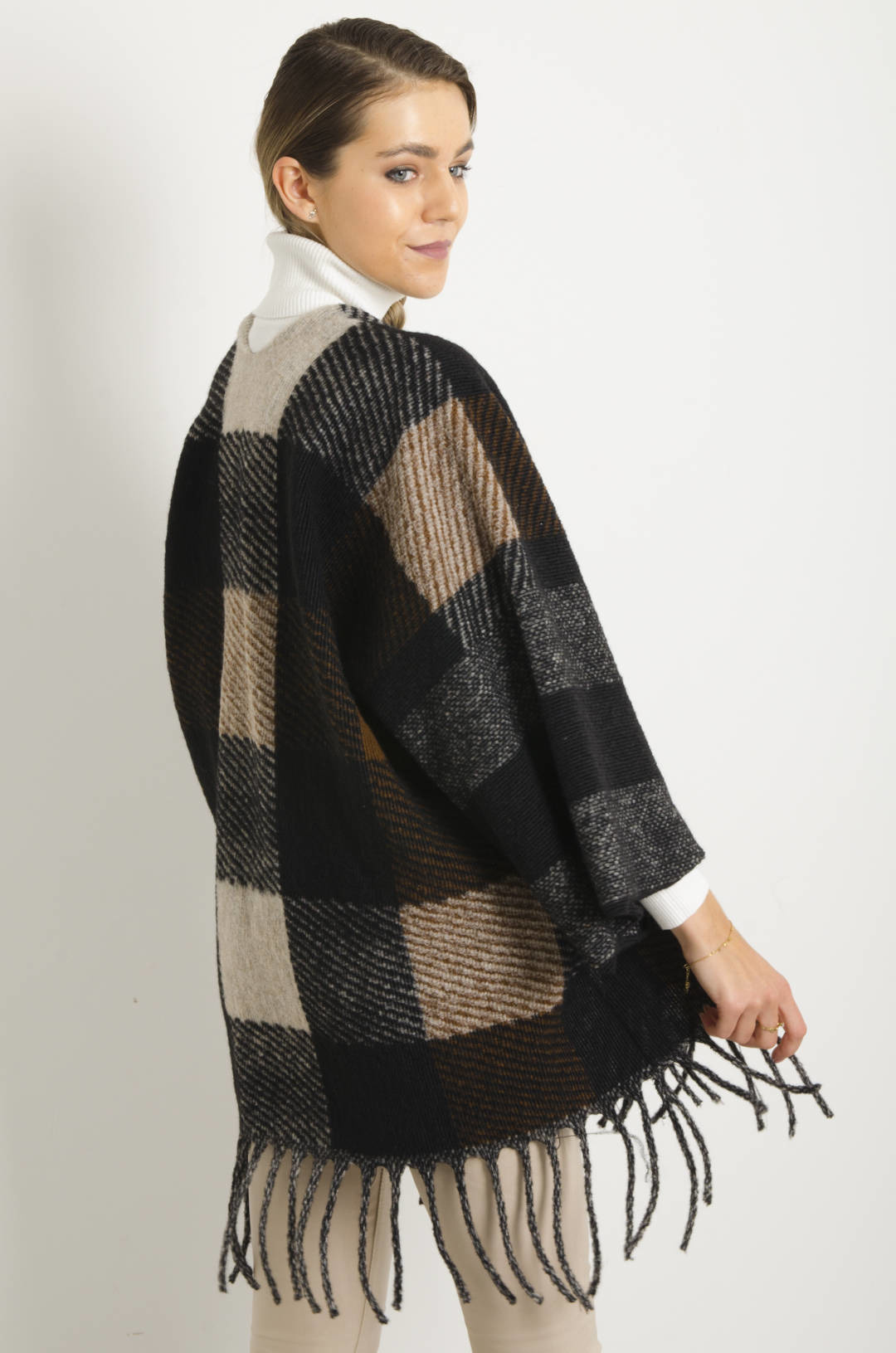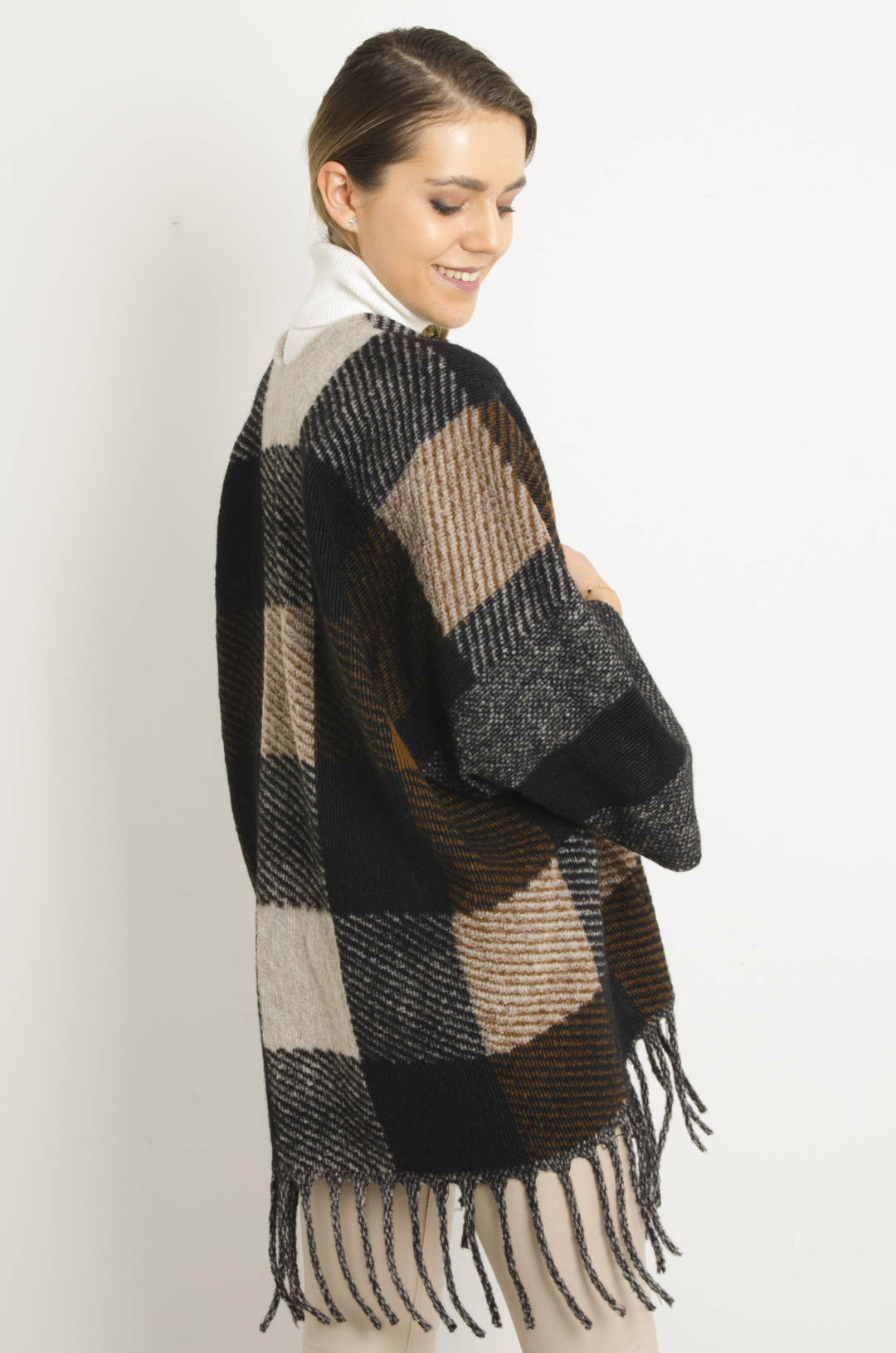 CZARNA NARZUTA W KRATĘ Z FRĘDZLAMI- PONCZO