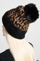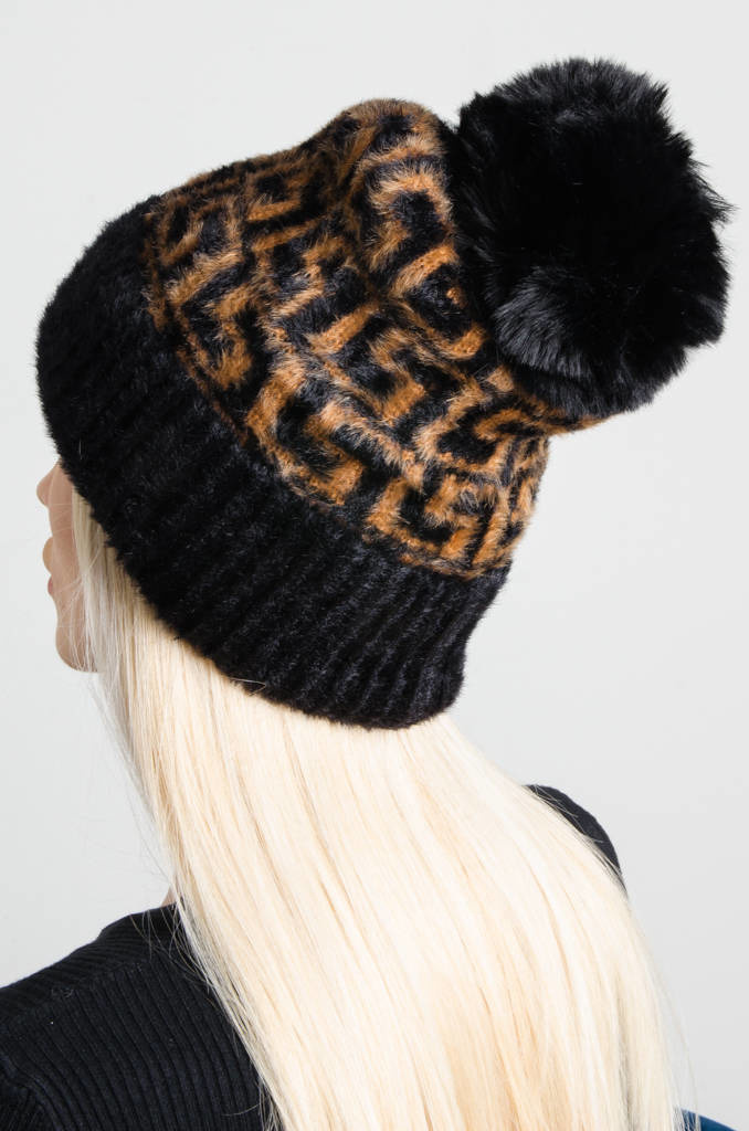 WZORZYSTA CZAPKA Z POMPONEM- CZARNA