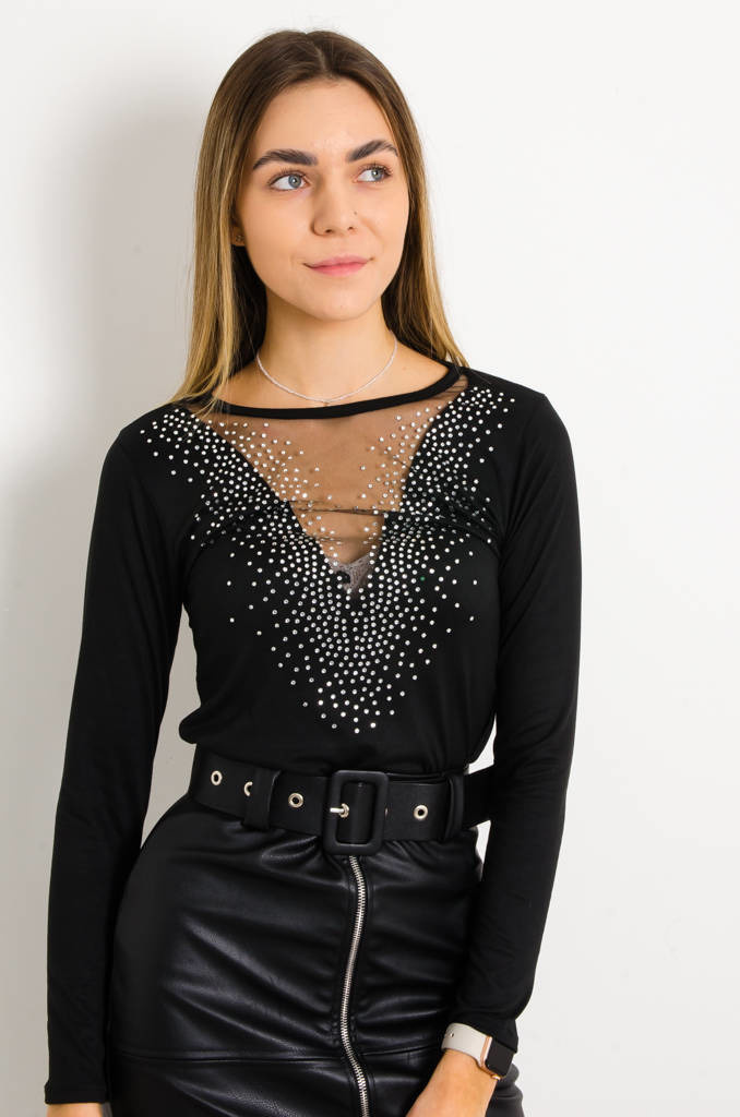 CZARNA BLUZKA Z OZDOBNYM DEKOLTEM Z SIATECZKI I CEKINAMI