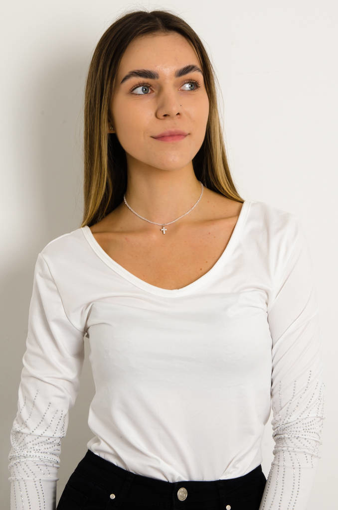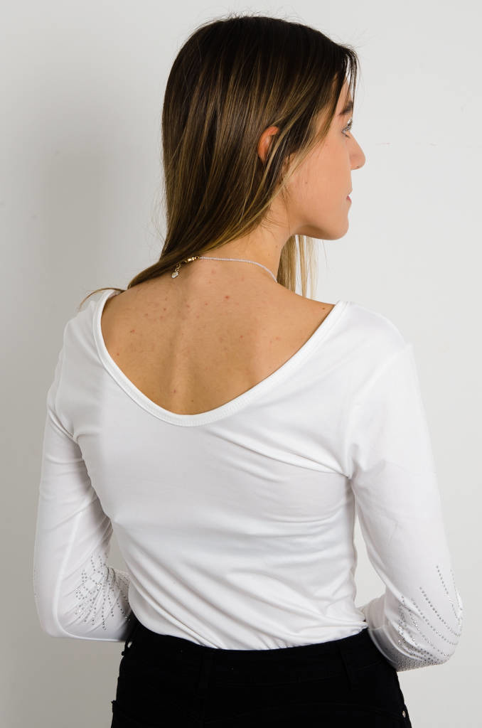 BLUZKA Z OZDOBNYMI CYRKONIAMI NA RĘKAWACH- BIAŁA