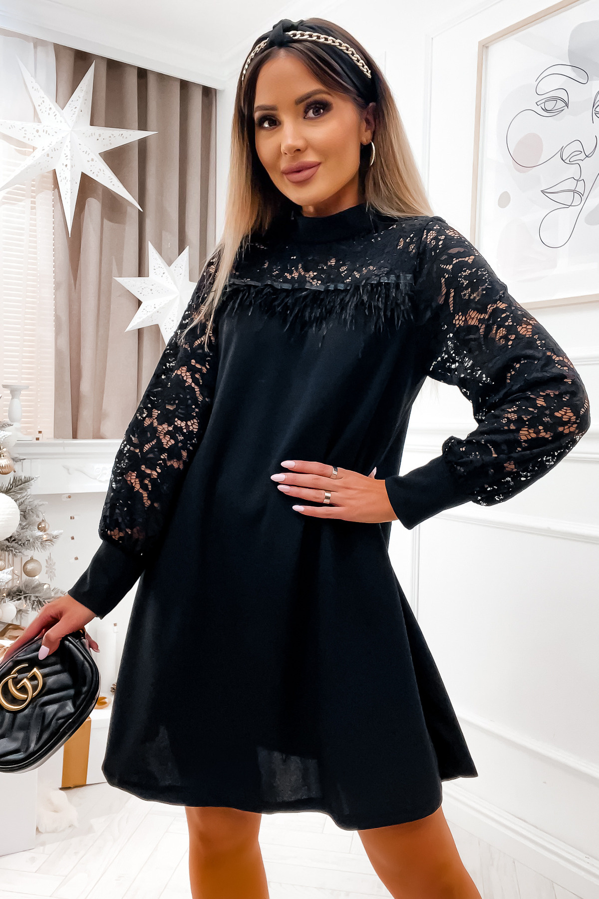 CZARNA SUKIENKA Z KORONKOWYMI WSTAWKAMI I OZDOBNYMI PIÓRKAMI
