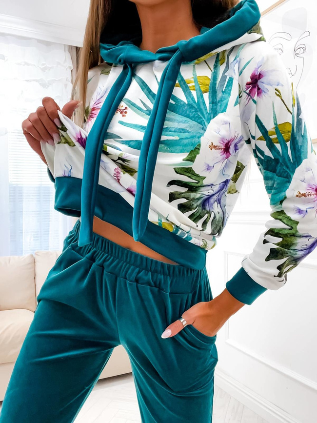 WELUROWY KOMPLET DRESOWY W KWIATY- BUTELKOWA ZIELEŃ