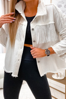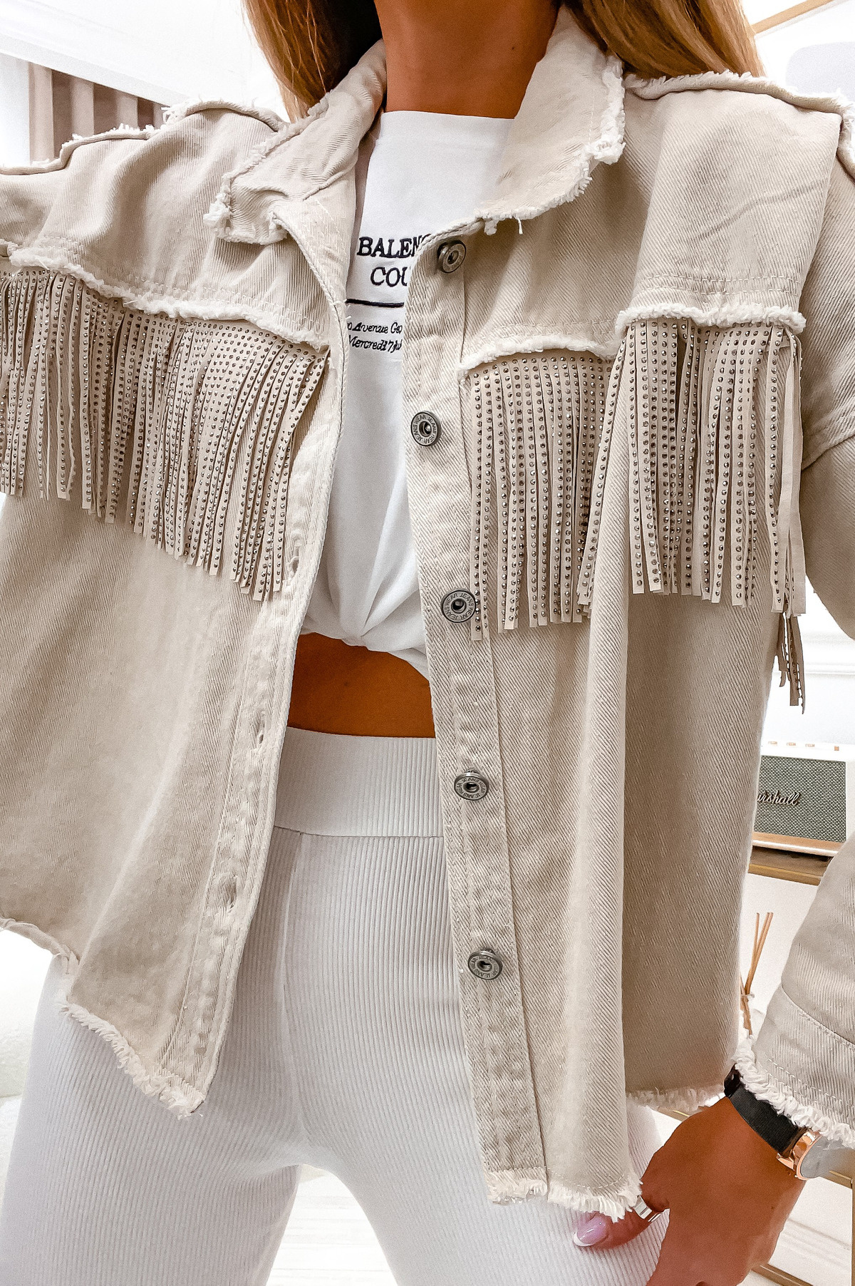 BEŻOWA KURTKA JEANSOWA Z FRĘDZLAMI