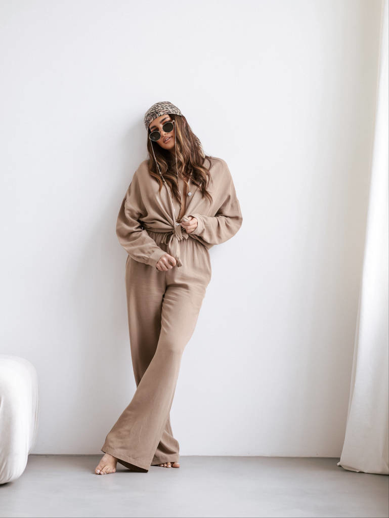 LNIANY KOMPLET KOSZULA+ SPODNIE- BRĄZOWY