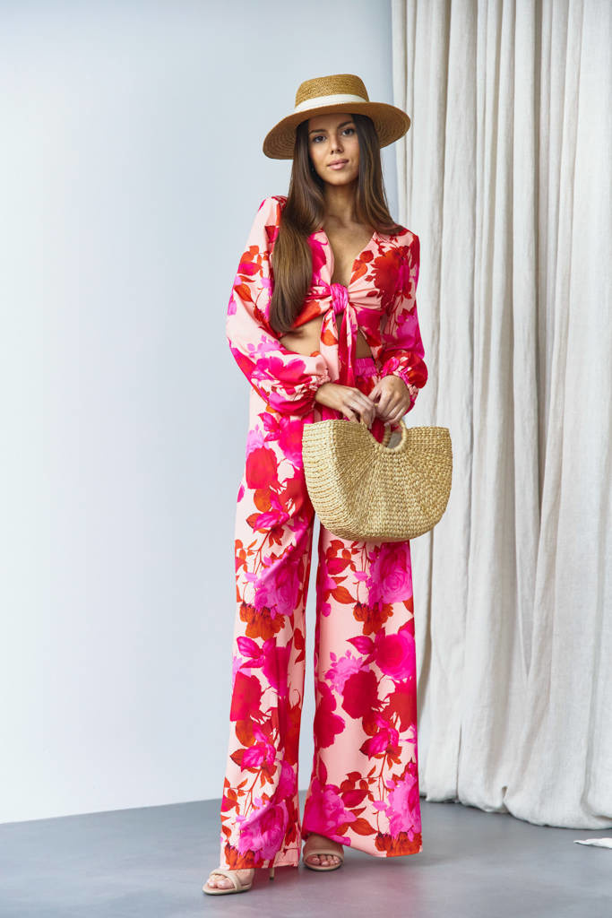 KOMPLET W KWIATY SPODNIE+ BLUZKA- RÓŻOWY