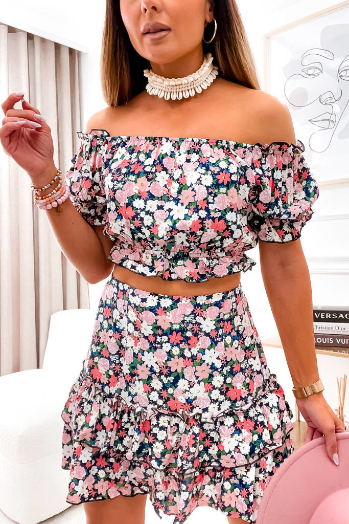 KOMPLET W KWIATOWY WZÓR SPÓDNICA+ BLUZKA HISZPANKA- CZARNY