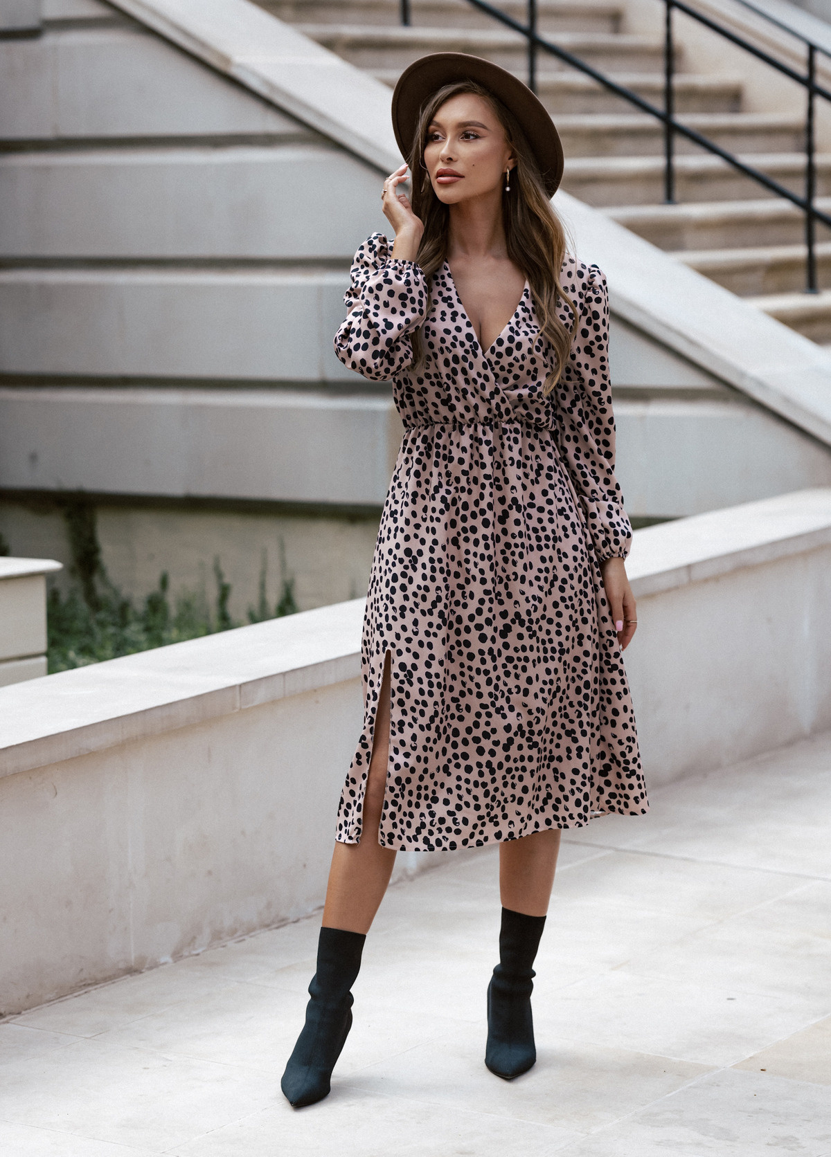 SUKIENKA W KROPKI Z GUMĄ W PASIE I ROZPORKIEM- CAPPUCCINO