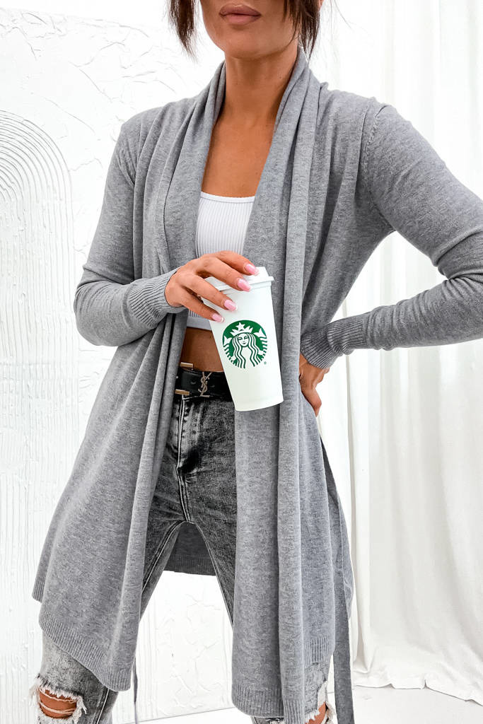 DZIANINOWA NARZUTA Z WIĄZANIEM W PASIE- SZARA