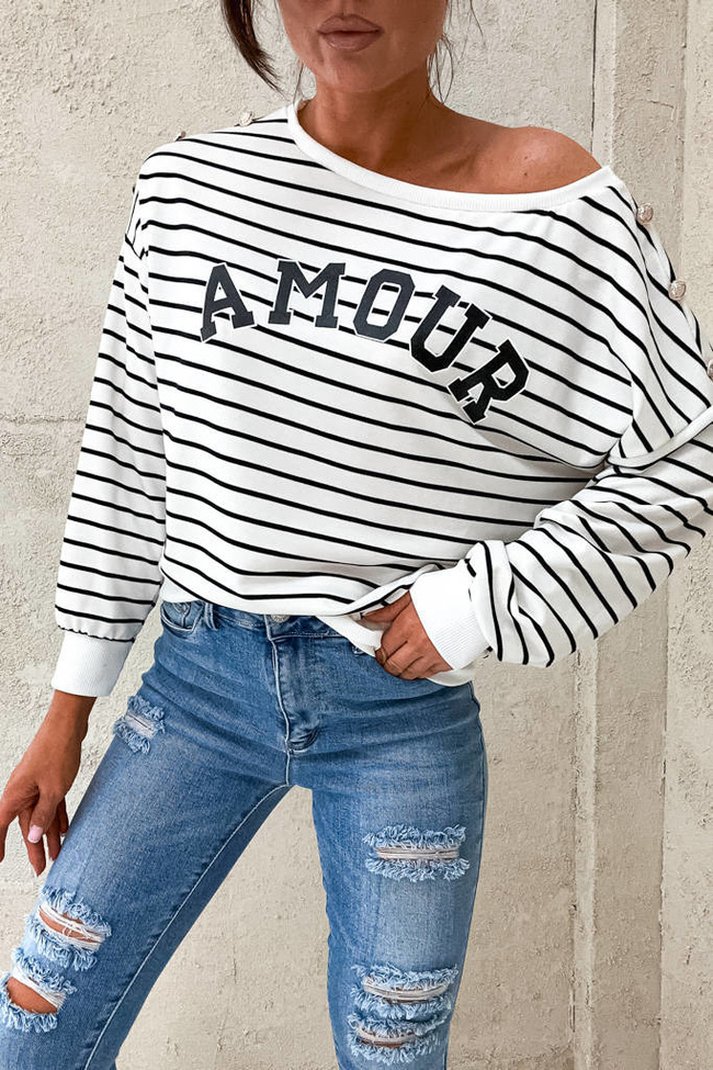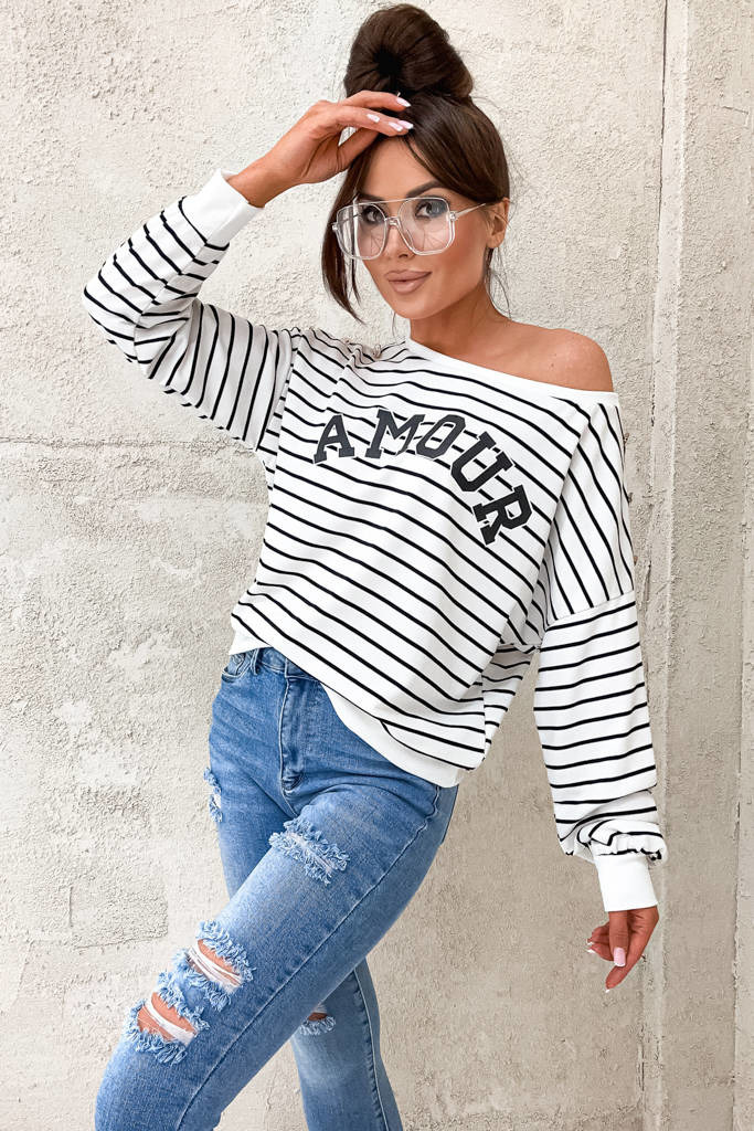 BIAŁA BLUZA W CZARNE PASKI Z OZDOBNYM NAPISEM I GUZIKAMI