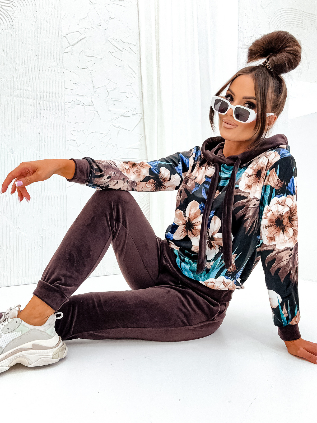 WELUROWY KOMPLET DRESOWY W KWIATY- CZEKOLADOWY