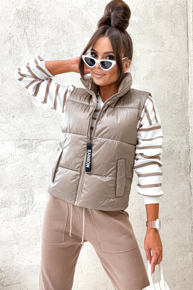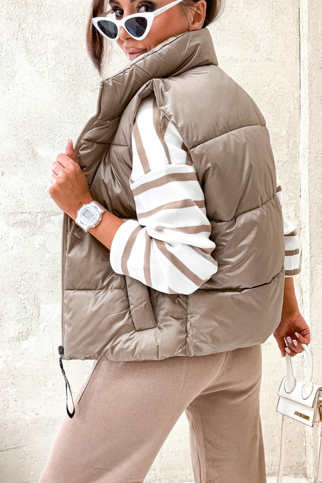 KAMIZELKA PIKOWANA Z KIESZENIAMI Z OZDOBNĄ WSTĄŻKĄ- BRĄZOWA