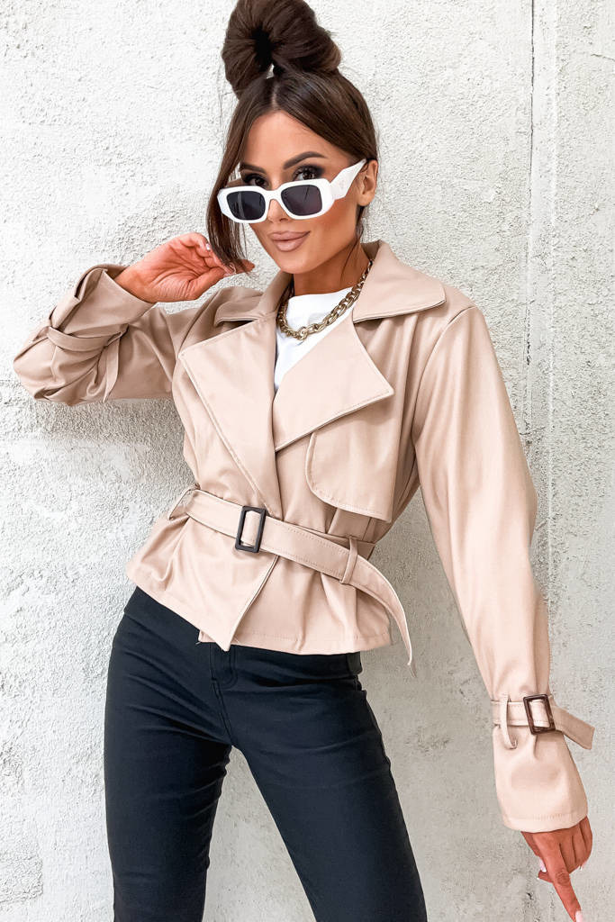 KRÓTKI TRENCZ RAMONESKA Z IMITACJI SKÓRY- BEŻOWY