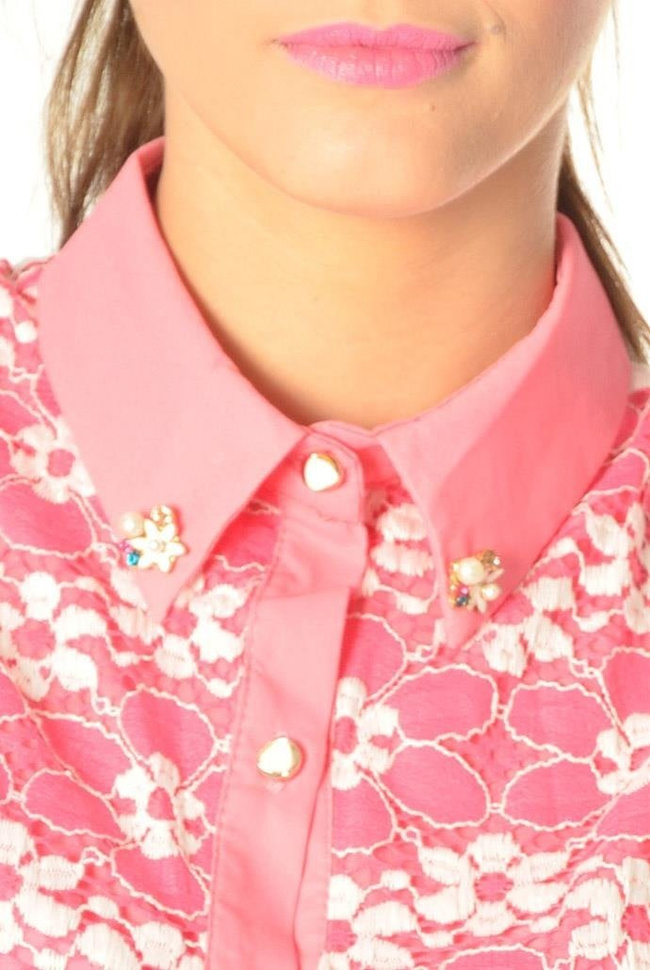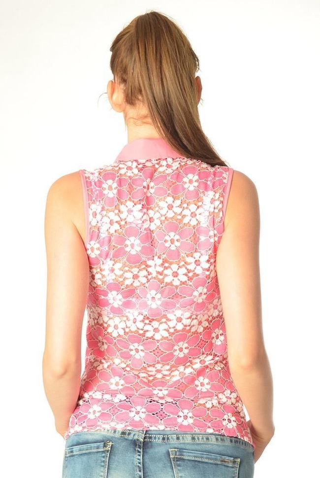 Koszula bez rękawów cała z koronki, Na kołnierzyku posiada śliczne ozdoby co do daje elegancji. Koszula jest dopasowana i bardzo ładnie podkreśla talię.