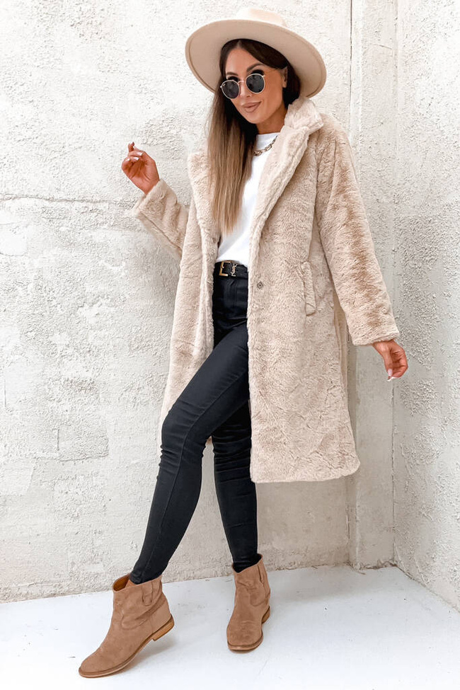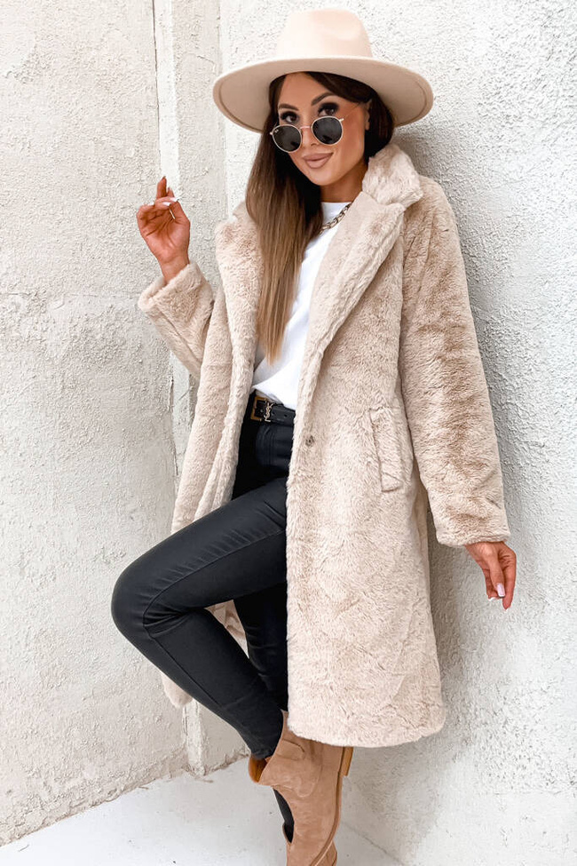 BEŻOWY FUTRZANY PŁASZCZ Z KIESZENIAMI