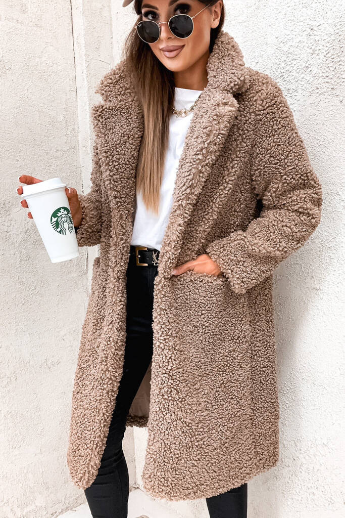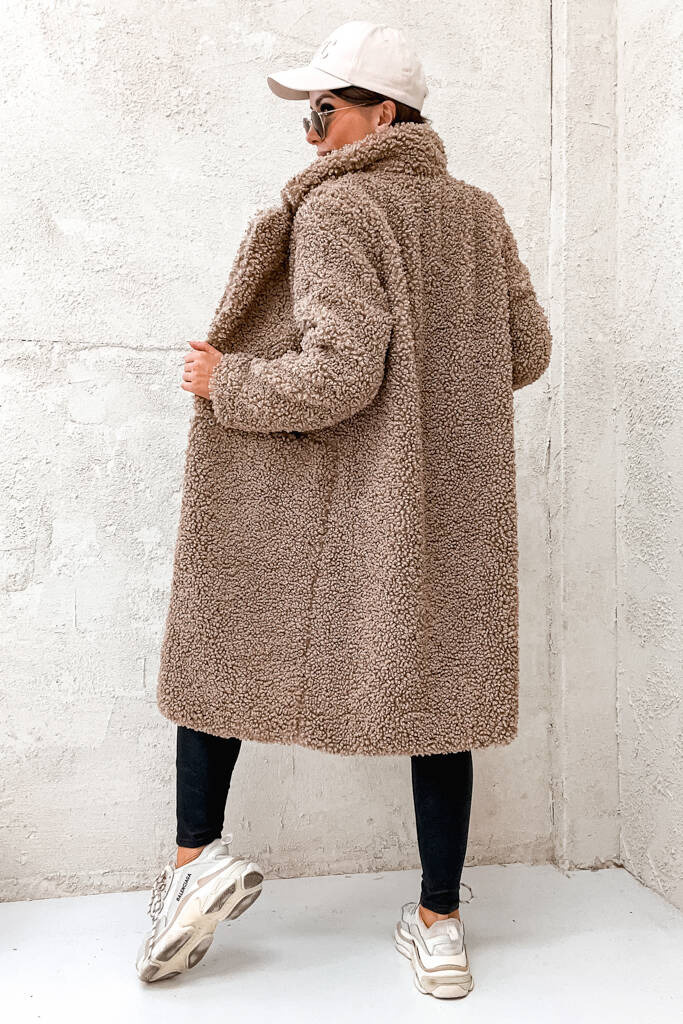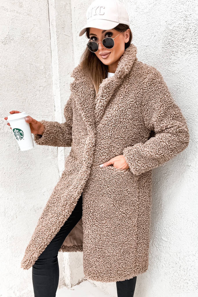 BRĄZOWY PŁASZCZ OWIECZKA ZAPINANY NA ZATRZASKI